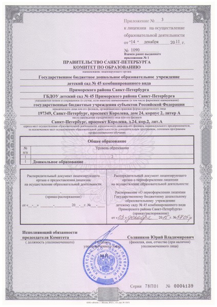 Образовательная деятельность осуществляется в ГБДОУ детский сад № 45 Приморского района Санкт-Петербурга по адресам: